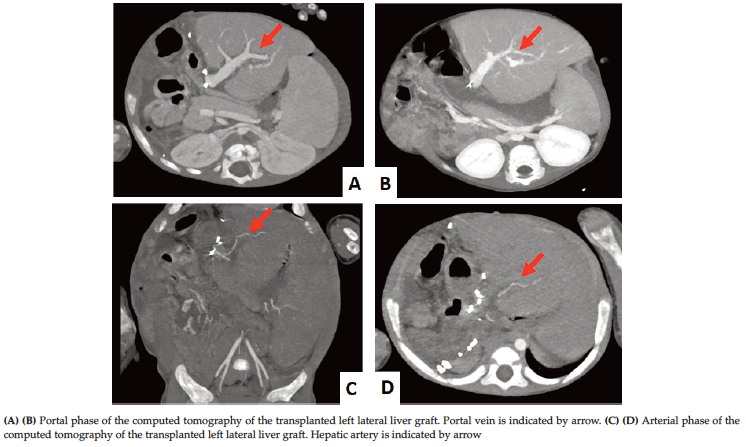 Eight of 9 LT recipients were children. All LTs were from living-related donors. Six of the recipients were male, and 3 of them were female. The most common indication for LT was biliary atresia (n = 4). The other etiologies were progressive familial intrahepatic cholestasis (n = 2), oxalosis (n = 1), tyrosinemia + hepatocellular carcinoma (HCC) (n = 1), and hepatitis B + HCC (n = 1). The mean age of children was 22 months (range, 3-96 months), and the adult recipient was 57 years old. The average weight of the recipients was 10.2 kg (range, 5-19 kg). The adult recipient’s weight was 74 kg. Demographics and clinical characteristics of LT recipients are summarized in Table 3. Five of the LT donors were mothers of recipients, 1 was a father, 1 was an uncle, 1 was an aunt, and 1 was a son. Seven of 8 liver grafts were left lateral segments, and 1 was a right segment. Abdominal CTs were performed on LT recipients on day 7 after surgery, and all results were normal (Figure 4). Mean serum total bilirubin values of the LT recipients were 0.9 mg/dL at post-operative day 7, 0.5 mg/dL at day 30, and 0.4 mg/dL at day 90 (Figure 5). Mean serum aspartate aminotransferase values of LT recipients were 38.1 U/L at postoperative day 7, 28.3 U/L at day 30, and 22.3 U/L at day 90 (Figure 6). The mean serum alanine aminotransferase values of recipients were 31.1 U/L at postoperative day 7, 23.7 U/L at day 30, and 15.2 U/L at day 90 (Figure 7). The average length of stay in the ICU was 3.4 days (range, 1-8 days). The average length of hospital stay was 17.1 days (range, 6-36 days). All LT recipients were discharged successfully. Only 1 liver recipient died (a pediatric patient), which was a result of oxalosis-induced heart failure 55 days after LT. He was discharged on day 26 after LT. Sixteen days after discharge, he returned to the hospital with heart failure and died on day 13 after admission.
