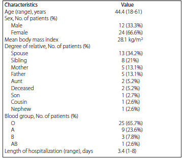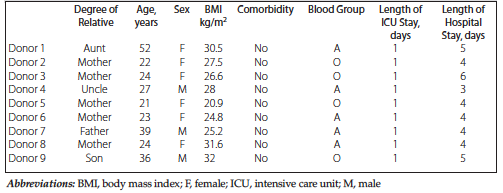 The mean age of the kidney donors was 44.4 years (range, 18-61 years). The average length of hospital stay of donors was 3.4 days (range, 1-8 days). Characteristics of kidney donors are summarized in Table 2. All living kidney donors were discharged without problems. All PCR tests performed before discharge were negative.