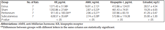 Results: Our statistical analyses showed that levels of kisspeptin receptors in the ovaries were lowest in the subcutaneously transplanted group (group 3; 628.57 ± 35.69 pg/mL). The highest serum anti-Müllerian hormone levels were found in the estrous group (group 4; 16.91 ± 2.12 ng/mL). Differences between groups in terms of serum kisspeptin-1 and estradiol concentrations were not statistically significant.