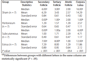In histologic examinations of the physiological structures on the ovaries, statistically significant differences were found among the experimental groups in terms of other parameters, with the exception of atretic follicle counts. In the peritoneal and subcutaneous rat groups, no ovaries had secondary follicles. Tertiary follicle count and number of corpus luteum were also lowest in the peritoneal and subcutaneous groups.