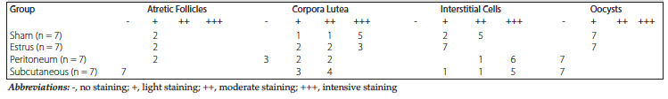 The histologic findings of the physiological structures on ovaries are summarized in Table 2. Statistically significant differences were found among rat groups in terms of other parameters, except for atretic follicle count (P < .001). None of the ovaries obtained from the peritoneal and subcutaneous groups included secondary folliculi. Tertiary follicle counts were lowest in the peritoneum (1.57 ± 0.65; P < .001) and in the subcutaneous groups (1.71 ± 0.61; P = .049). The corpus luteum count was also found to be lowest in the peritoneum (2.57 ± 1.11; P < .001) and in the subcutaneous groups (4.71 ± 1.17; P < .001).