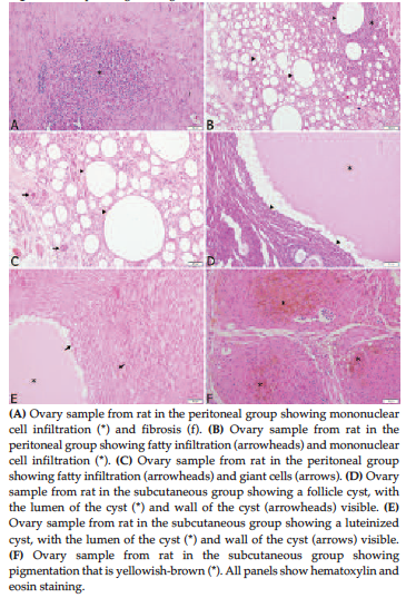 In the subcutaneous group, inflammation was observed in the ovaries of 4 rats, fibrosis in 6 rats, fat infiltration in 6 rats, and follicular cysts in 3 rats (Figure 1D). One rat showed luteal cysts (Figure 1E), and pigmentation in ovaries occurred in all rats (Figure 1F).