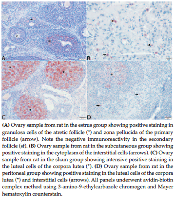 Immunohistochemical tests did not reveal KiSS-1-positive cell staining in granulosa cells of primordial, primary, secondary, and tertiary follicles of rats in all experimental groups. The most intense kisspeptin immunoreactivity was noted in early corpus luteum. The intensity of staining in the corpus luteum decreased in the peritoneal and subcutaneous groups compared with that shown in the sham and estrus groups, whereas the intensity of staining was increased in interstitial cells.