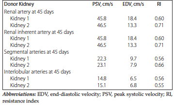 Pediatric en bloc kidney transplant is a safe and reasonable transplant surgery option.3 Vascular complications after renal transplant is a common problem in procedures involving kidneys from pediatric donors, especially infants, which is mainly attributable to renal artery thrombosis and anasto-motic stenosis, which have reported incidence rates of 4.2% to 11%.4,5 This complication is the main cause of damage to renal function or even the failure of function.6 Therefore, a key for improved survival is monitoring of blood perfusion, the rejection action, the vessels, and anastomotic stenosis, to allow early and accurate diagnosis and to offer reasonable treatment. Due to its convenience, safety, and ability to be repeated and its ability to provide dynamic assessments, ultrasonography has become the most common way for examination. Ultrasonography can allow clinicians to fully understand the structure of the kidney transplant and its complications. Color Doppler flow imaging and frequency Doppler flow imagining techniques can provide more sensitive results.7,8 Therefore, the use of color Doppler flow imaging can help observation of blood perfusion and several flow indexes and early detection of complications, as well as allow effective guidance regarding treatment.