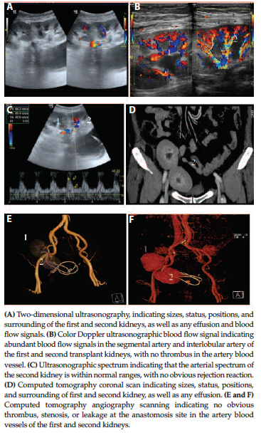 Figure 1D, 1E, and 1F show the ultrasonography and computed tomography angiography results. After 45 days of dynamic assessment, we observed no obvious rejection. Ultrasonographic monitoring made it possible to observe development of the transplanted kidneys, understand changes in the internal structure, and view blood flow, its frequency spectrum, and its resistance index. Being able to make a dynamic assessment of the donor’s kidneys allowed us to make timely suggestions and prevent complications.