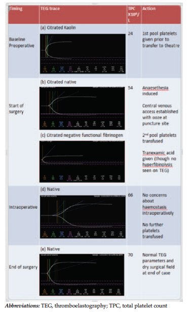At presentation to our renal transplant unit, the patient was on hemodialysis due to ESRF. Our multidisciplinary transplant planning team advised administration of prophylactic platelet infusion before transplant to increase platelet count to 80 to 100 × 109/L. On the morning of the transplant procedure, the baseline platelet count was 20 × 109/L, and a pool of cytomegalovirus-negative irradiated platelets was transfused. Repeat platelet count showed an increase to 54 × 109/L. Thromboelastography was performed, which revealed near normal clot strength as described by the maximum amplitude (MA). Citrated native MA was 43.6 mm (reference range, 44-65 mm), and citrated native fibrin MA was 16.5 mm (reference range, 14-24 mm). Anesthesia was induced, invasive lines were inserted, and transplant surgery commenced.