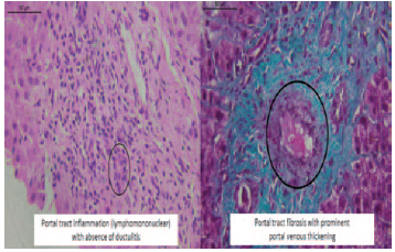 In view of new-onset portal hypertension, hepatic venous pressure gradient study and a transjugular liver biopsy were conducted from the right lobe. The pressure studies showed free hepatic venous pressure of 11 mm, wedged hepatic venous pressure of 15 mm, and hepatic venous pressure gradient of 4 mm. The patient’s liver biopsy was suggestive of mild portal tract inflammation with portal tract fibrosis with prominent portal venous thickening (Figure 1).