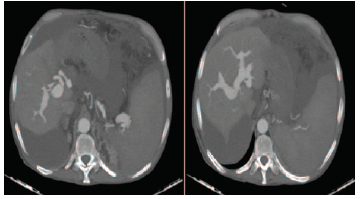 Figure 2. Axial Sections of Computed Tomography Scan Showing Simultaneous Rapid Flow of Contrast in Hepatic Artery and Portal Veins