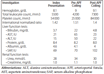 The patient underwent digital subtraction angiography (DSA), which was followed by embolization of the APF (Figure 3). After embolization, there was a gradual decrease in serum bilirubin (maximum 21 to 4.2 mg/dL) and resolution of ascites. A repeat Doppler scan of the portal venous system showed established hepatopetal flow with progressively rising portal flow velocities. The patient’s platelet count also gradually increased, and his symptoms resolved over the next 6 months.