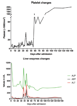 The patient’s platelet count increased on postadmission day 58 to 102 × 109/L following full treatment of viral infection, with liver function tests showing normal results after treatment with everolimus. Regular follow-up showed continued elevations in platelet count until month 3 after discharge, at which time prednisolone was tapered to 0.5 mg/kg per day (Figure 2).