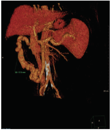 Suspicion for a portal steal syndrome was raised on the basis of the CT scan, the patient’s clinical condition, and laboratory findings. The case was promptly discussed with the interventional radiology team to evaluate the best treatment option.