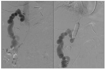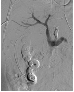 A 5F percutaneous transhepatic right portal access was obtained: the portography confirmed the presence of a high-flow mesocaval shunt with portal steal syndrome and subocclusion of the portal vein.