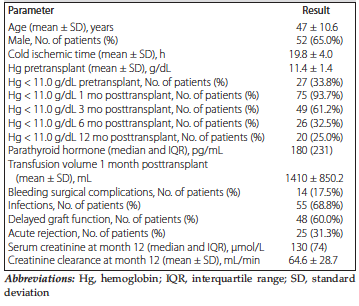 Recipient data included pretransplant hemoglobin and pretransplant serum parathyroid hormone levels, kidney graft function, delayed graft function, acute rejection occurrence, posttransplant infections, surgical bleeding, transfusion volume, and serum tacrolimus levels at time of anemia recovery. Serum iron and ferritin levels, transferrin saturation, C-reactive protein, and serum parathyroid hormone levels were measured 6 and 12 months after transplant. Diagnosis of acute rejection was made by allograft biopsy or based on deterioration of allograft function that had improved after high doses of corticosteroid therapy. Hemodialysis during the first 2 weeks after transplant was consistent with a definition of delayed graft function.