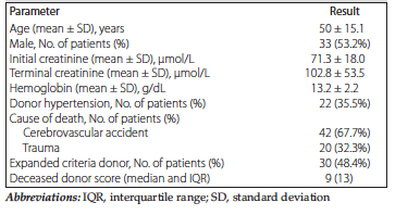Sixty-two deceased donors (33 male) of mean age 50 ± 15.1 years with a cerebrovascular accident as the most frequent cause of death had initial serum creatinine of 71.3 ± 18.0 μmol/L and terminal creatinine of 102.8 ± 53.5 μmol/L. History of donor hypertension was evident in 35.5% of cases, and 48.4% of donors were classified as expanded criteria donors (Table 2). Deceased donor score of donors below 60 years old was significantly lower than the same score of donors above 60 years old (7.02 ± 5.61 vs 14.21 ± 4.94; P < .01).