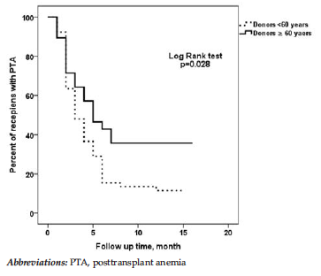 The aim of this study was to evaluate associations among donor, recipient, and transplant characteristics and posttransplant anemia recovery rate as well as to define whether donor age older than 60 years affects posttransplant anemia recovery.