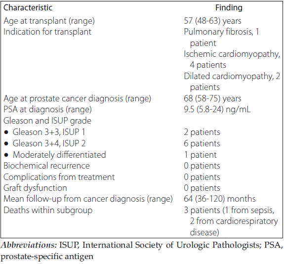 One patient (7%) who developed prostate cancer at age of 69 years, at 4 years after lung transplant, opted for watchful waiting. A Gleason 3+4=7 disease score with a PSA of 4.8 ng/mL was confirmed on biopsy; however, the patient died within 12 months as a result of severe respiratory disease.