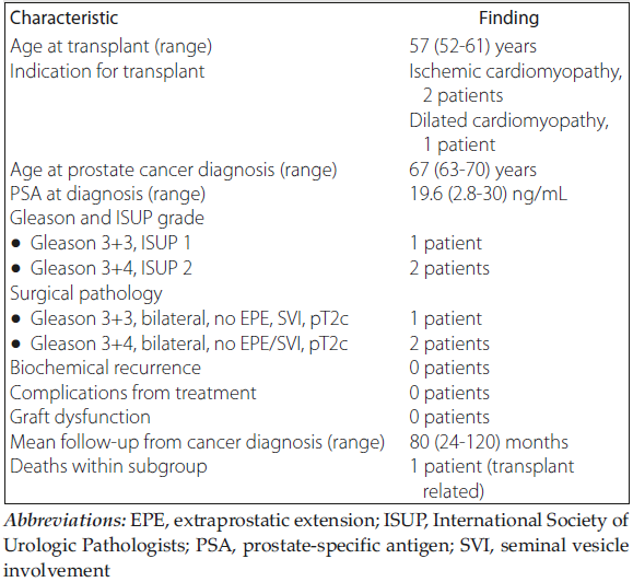Three heart transplant recipients with prostate cancer (21%) opted for radical surgery, with 1 having open radical prostatectomy and 2 having robotic-assisted laparoscopic prostatectomies. Characteristics of this subgroup are shown in Table 3. To date, none of these patients have had biochemical recurrence (PSA >0.03 ng/mL) of cancer following treatment. Functionally, all patients were fully continent, although all displayed erectile dysfunction postoperatively. One patient died 8 years after prostatectomy; however, this death was unrelated to prostate cancer (PSA of 0 ng/mL prior to death).
