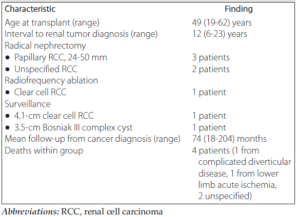 Data from the United Kingdom have suggested that heart and lung transplant recipients are 2.5 and 4.4 times more likely to be diagnosed with kidney cancer compared with the general population, respectively, with highest incidence among male patients and those over 60 years of age.13 In kidney transplant recipients, increasing age and acquired renal cystic disease specifically are thought to be behind the increase in RCC.13 Furthermore, it must be considered that a certain proportion of transplant recipients will develop chronic renal impairment, a well-recognized complication of immunosuppression after organ transplant and an independent risk factor for development of renal malignancies.14 In our series, all patients with renal tumors had some degree of chronic renal impairment.