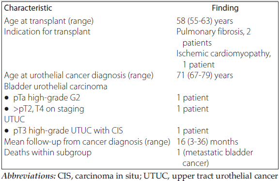 Table 5. Characteristic and Management of Patients Diagnosed With Bladder and Upper Tract Urothelial Malignancy Following Heart and Lung Transplant