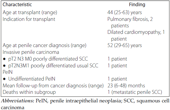 Table 6. Characteristic and Management of Patients Diagnosed With Penile Malignancy Following Heart and Lung Transplant