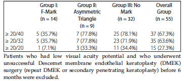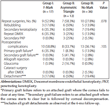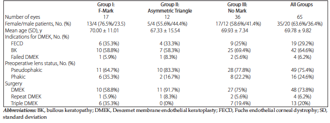 Materials and Methods: In this single-center retrospective study, 65 eyes from 55 patients that had received various types of marking or no marking and that had been used for Descemet membrane endothelial keratoplasty endothelial graft preparation were included. Patients were divided into 3 groups according to the marking technique used: group I (F-marked graft; 17 eyes), group II (asymmetric triangle-marked graft; 12 eyes), and group III (unmarked graft; 36 eyes). The main outcome measurements were best-corrected visual acuity, endothelial cell density, central corneal thickness, postoperative complications, rebubbling, and secondary keratoplasty rates.