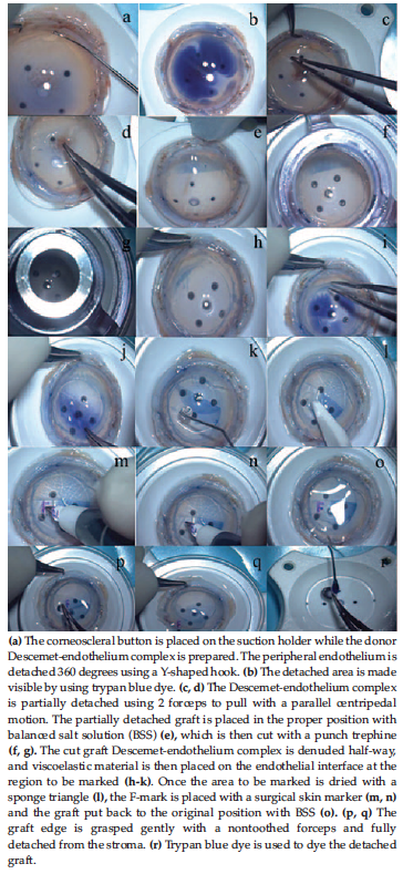 After the graft cut with the punch trephine was stripped halfway, viscoelastic substance (sodium hyaluronate 1.4%; Bio-hyalur EV; Biotech, Gujarat, India) was inserted between the endothelial surfaces in the region to be marked to prevent contact in the F-mark group. An F-mark was placed directly onto the stromal aspect of the Descemet-endothelium complex with a surgical skin marker, and the graft was brought into its original position using balanced salt solution. The marked graft edge was then grasped using non-toothed forceps to enable stripping from the stroma (Figure 1).