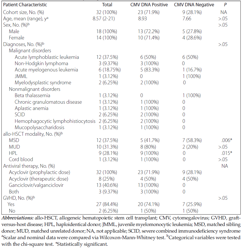Materials and Methods: Thirty-two pediatric recipients of allogeneic hematopoietic stem cell transplant to treat various malignant and nonmalignant disorders were prospectively monitored for cytomegalovirus infection. The real-time quantitative polymerase chain reaction was used for pathogen detection and quantitation. Demographic and virologic parameters were statistically analyzed with SPSS statistics software (version 20).