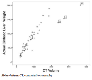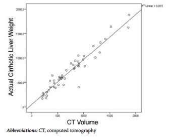 Computed tomography (CT) volumetry generally is the criterion standard for preoperative evaluation of graft volume in LDLT. Its usefulness has been widely studied in healthy living donors.5-9 However, the effectiveness of CT volumetric assessment of cirrhotic livers has been poorly analyzed. In this study, we aimed to evaluate manual CT volumetry to assess total liver volume by comparing total hepatectomy specimen weights in patients with cirrhotic liver disease undergoing LDLT.