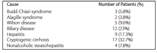 The study group consisted of 52 patients with cirrhotic liver disease who required LDLT. Of the 52 patients, 31 were men and 21 were women (mean age 6.5 years; range, 0.5-56 years). Patients were seen at our institution between March 2011 and November 2015. Causes of liver disease are listed in Table 1.