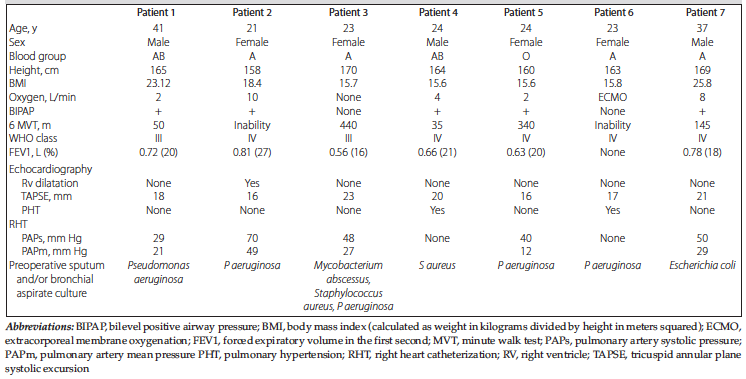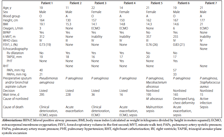 Fourteen patients (7 females and 7 males) were evaluated as lung transplant candidates with the diagnosis of CF. The mean age of the patients who were listed for lung transplant was 22.8 years (range, 11-47 years). Eleven patients were listed for lung transplant. Three patients were urgently listed without any pretransplant evaluation. These patients were regularly followed by an external center and worsened because of acute exacerbation. Table 1 shows the characteristic data of the patients at the time of evaluation for lung transplant who were not suitable for lung transplant and died on the wait list.