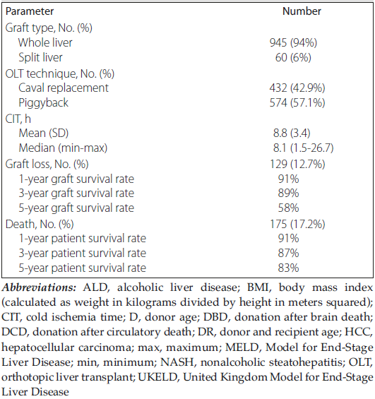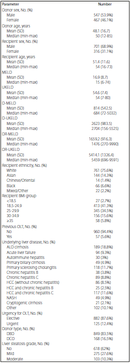We retrospectively reviewed our prospectively maintained database in November 2019 for OLTs performed in our department between January 2008 and November 2019. This is the source of validated data for our department provided to the National Health Service Blood and Transplant organization. We chose January 2008 as the beginning of our study period because the UKELD score was introduced in that year. Over this period, 1038 liver-only transplants from deceased donors were performed: 870 (83.8%) from donation after brain death (DBD) and 168 (16.2%) from donation after circulatory death (DCD). We included 1017 OLTs (849 DBDs [83.5%] and 168 DCDs [16.5%]) in our analysis, after excluding 21 cases for which we did not have both preoperative MELD and UKELD scores available. Table 1 summarizes patient and transplant characteristics.