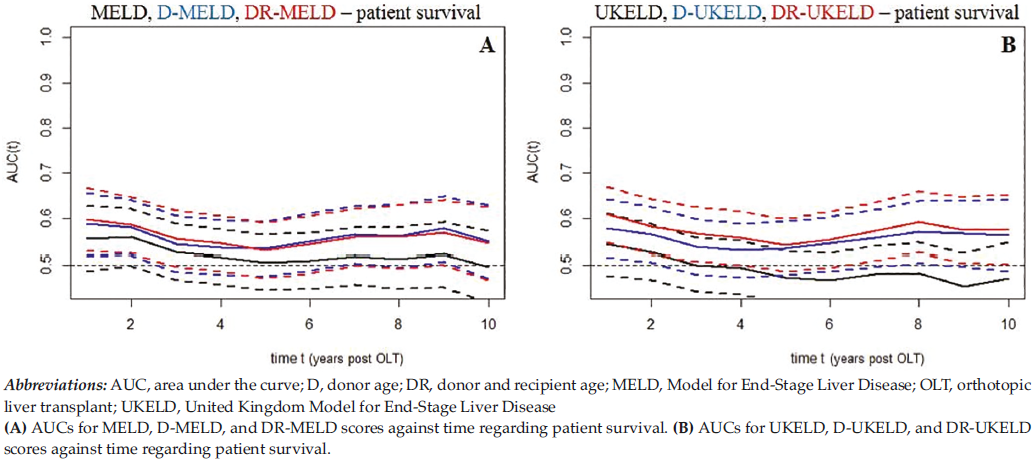 Our findings are in accordance with other studies on MELD, UKELD, and D-MELD scores, reporting no or poor predictive ability in terms of graft loss and death.6-12,14 First, we found that none of the 6 tested scores had any actual ability to predict graft loss after OLT. In addition, MELD and UKELD scores did not have any ability to predict death after OLT. However, D-MELD, D-UKELD, DR-MELD, and DR-UKELD scores showed some predictive ability, albeit mediocre, with regard death, but mainly for the first 2 years post-OLT (3 years for the DR-UKELD score). The highest AUCs were detected at 1 year after OLT, with DR-MELD and DR-UKELD scores providing higher AUCs than D-MELD and D-UKELD, respectively. Another interesting finding was that the improvement in AUCs by the addition of just donor age to MELD or UKELD models was not statistically significant, which agrees with what a few other studies have already reported.7,9-11 However, the addition of both donor and recipient age to MELD and UKELD scores resulted in a statistically significant improvement in their AUCs. Moreover, MELD and UKELD did not seem to have different predictive ability, and the same was true when we compared the scores derived from them (namely, D-MELD with D-UKELD and DR-MELD with DR-UKELD). Thus, MELD and UKELD have the same predictive ability, which significantly improved in terms of patient survival when both donor and recipient age were added to each model; however, it only reached mediocre levels and was best for 1-year patient survival post-OLT.