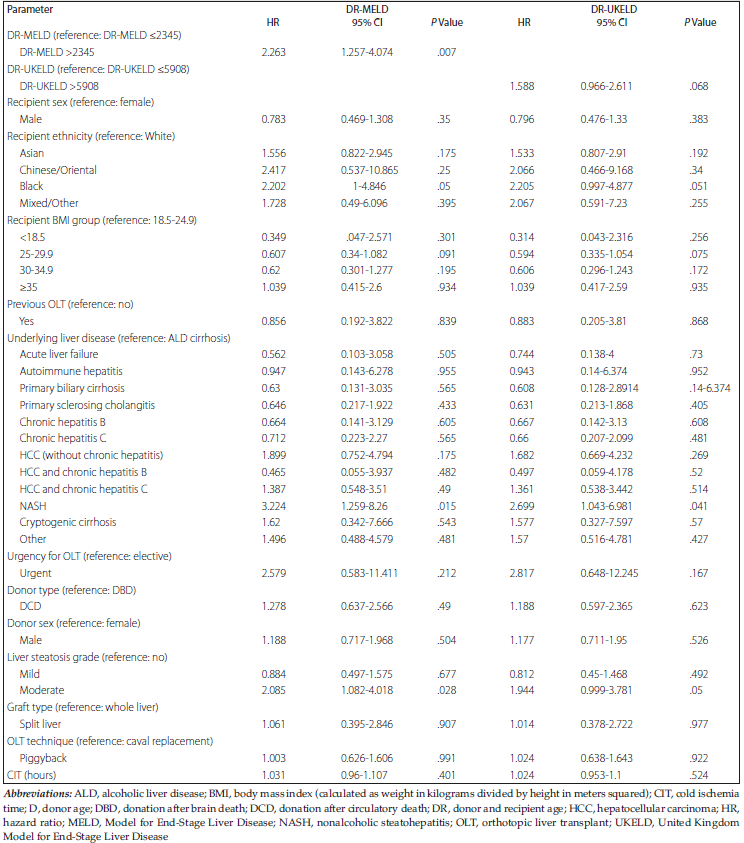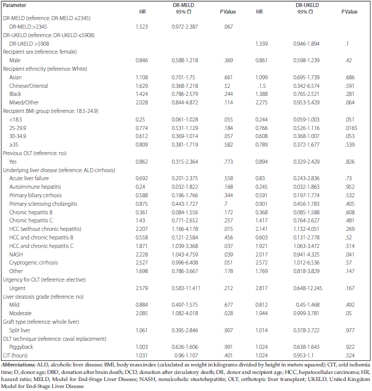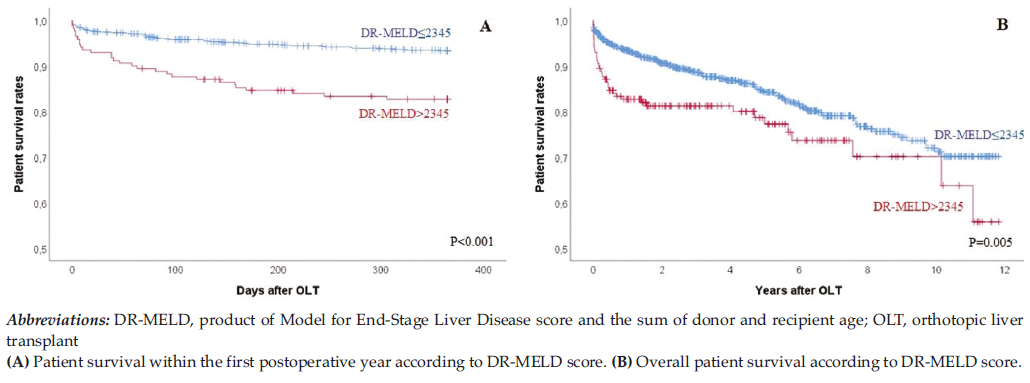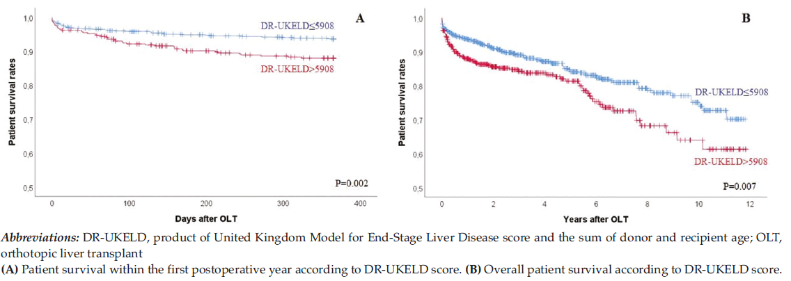 DR-MELD >2345 and DR-UKELD >5908. Recipients with DR-MELD >2345 (P < .001) and DR-UKELD >5908