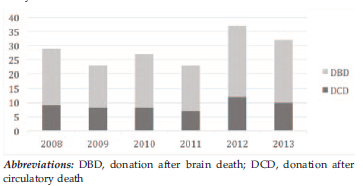 We conducted a retrospective review of all LTs performed at our transplant center from July 1, 2007 to February 28, 2014. Outcomes of LTs performed with allografts from DCD were compared with allografts from donors after brain death (DBD) during the study period. All donor and recipient variables were carefully reviewed and recorded.