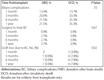 Table 5. Frequency and Severity of Biliary Complications in the First Year After Transplant Among Recipients of Grafts from Donors After Brain Death and Donors After Circulatory Death and Impact on Graft Loss