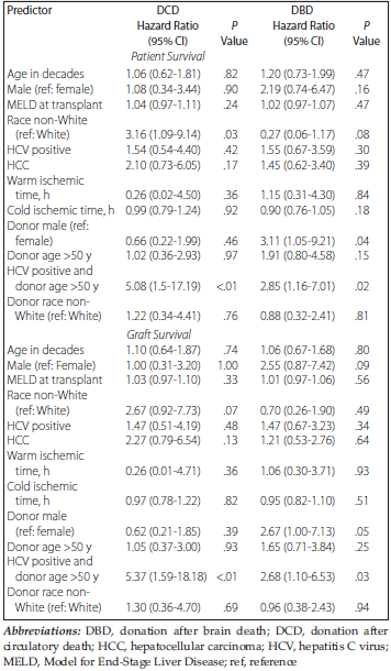 Forward stepwise selection was performed to develop a final multivariable model predicting graft and patient survival by evaluating all donor, procurement, transplant, and recipient variables. On univariable analysis, we found that HCV recipients who received an organ from donors >50 years old was predictive of graft survival (hazard ratio [HR] = 5.37; 95% CI, 1.59-18.18; P < .01) and patient survival (HR = 5.08; 95% CI, 1.5-17.19; P < .01) in DCD recipients. (Table 7) Of note, donor age alone was not predictive of graft or patient survival. Non-White ethnicity of the recipient was also associated with patient survival.