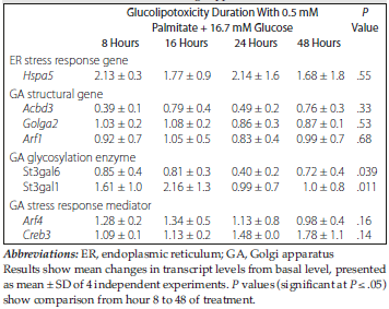 Materials and Methods: To mimic lipotoxicity and glucolipotoxicity as metabolic stresses for beta-cell failure, rat insulinoma INS-1E cells were treated with palmitic acid, glucose, or both. Cells were cultured in the presence of 5.0, 16.7, or 33 mM glucose with or without 0.5 mM palmitic acid for 8, 16, 24, and 48 hours. Incubation in the presence of any of the 3 concentrations of glucose with 0.5 mM palmitic acid provided glucolipotoxicity. In addition to the endop-lasmic reticulum stress marker (Hspa5), we evaluated changes in Golgi function under experimental metabolic stresses. In doing this, we measured expression levels of the genes coding Golgi structural proteins (Acbd3, Golga2, and Arf1), Golgi glycosylation enzymes sialyltransferaz10 and sialyltransferase 1 (St3gal1), and Golgi stress mediators (Creb3 and Arf4).