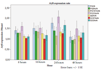 Arf4 transcript levels showed a nonsignificant increase of about 1.5 times from basal levels in the lipotoxic media during the first 24 hours. There was a striking increase in the Arf4 gene expression level in cells treated with 0.5 mM palmitate and 33 mM glucose compared with the basal level (Figure 1, Table 4). Although this increase from the basal level was shown for all treatment durations with 0.5 mM palmitate and 33 mM glucose, Arf4 levels with high glucose treatment was statistical significant, especially with 8 and 24 hours of treatment (P = .05 and P = .03, respectively). Arf4 transcript levels significantly changed (P = .038) during the treatment periods only with 5 mM glucose and 0.5 mM palmitate, with an early increase in the first 24 hours and a decline at 48 hours (Table 5). In all other intervention groups, there was no significant variation among the treatment durations.