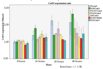 With any glucose concentration, we observed no significant change in either Arf4 and Creb3 transcript levels (Figures 1 and 2 and Table 2).