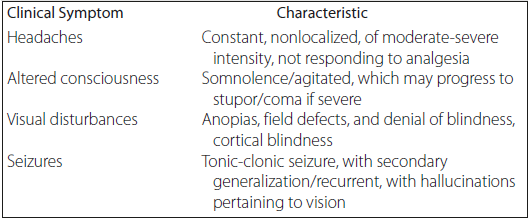 Clinical features can be an acute presentation to subacute, with various degrees of severity, with mild cases only presenting as a headache with or without visual disturbances or with severe cases presenting as altered levels of consciousness and seizures. Clinical manifestations are shown in Table 2.