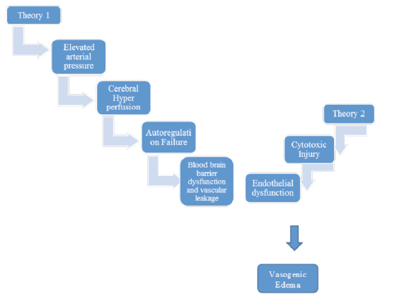 The rate of elevation of blood pressure determines the occurrence of PRES. In chronic elevation of blood pressure, corrective, adaptive changes set in and regulate the blood flow to reset the autoregulation to new higher blood pressure to maintain constant cerebral blood flow. However, when there is an acute rise in blood pressure, cerebral autoregulation fails. As the blood pressure rises above the upper range of autoregulation, there is dilatation of cerebral arterioles, and this passively increases the perfusion pressure across the vessels and causes disruption of the blood-brain barrier (BBB), which results in exudation of plasma proteins and fluid across the BBB. Autoregulation maintains intracranial blood flow constant in the given range of blood pressure by vasoconstriction arteriolar dilatation.6 Posterior circulation is more vulnerable to elevation in blood pressure and failure of cerebral autoregulation, as this part of the circulation lacks the sympathetic tone in the basilar artery vasculature.7