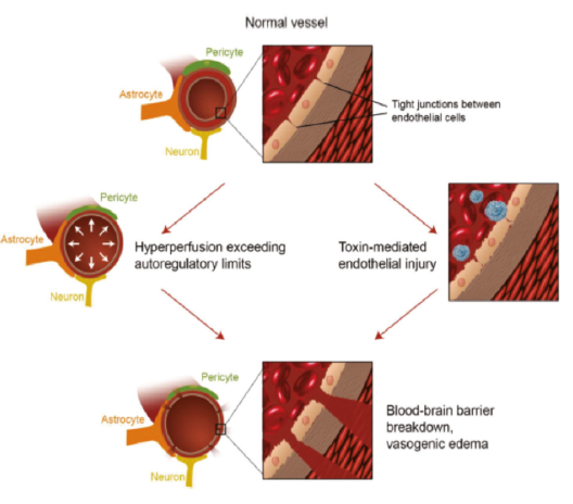 Of patients with PRES, 30% do not have hypertension; these patients also do not have failure of autoregulation.8,9 In these cases, there is endothelial dysfunction that is caused by one of the following endogenous or exogenous factors: immunosup-pressive medications, chemotherapy, or sepsis.10 In these situations, the circulating toxins and cytokines cause damage to vascular endothelium, leading to vasogenic edema and endothelial ischemia, leading to the disruption of BBB by increasing permeability resultant leakage of fluids and proteins in the extravascular compartment.