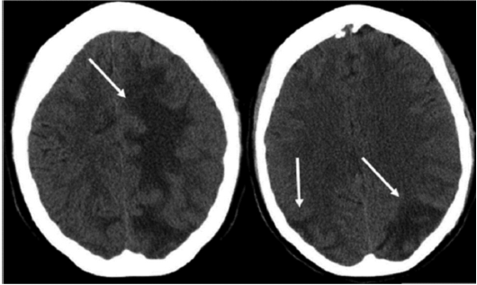 Figure 3. Noncontrast Computed Tomography Images Showing Vasogenic Edema Involving Both Parietal and Occipital and With Extension Into Left Frontal Lobe11