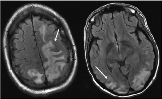 Figure 4. T2-Fluid-Attenuated Inversion Recovery Magnetic Resonance Images Showing Vasogenic Edema Around Both Occipital and Parietal Lobes and Extension of Edema in Left Frontal Lobe12