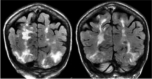 Figure 5. Coronal T2-Fluid-Attenuated Inversion Recovery Magnetic Resonance Images Showing Involvement of Parietal Lobes and Occipital Characteristic of Posterior Reversible Encephalopathy Syndrome12