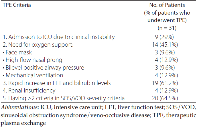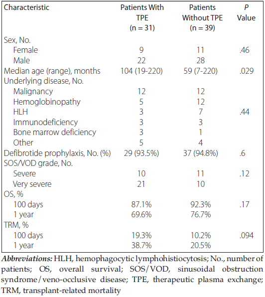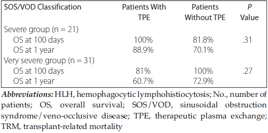 Our study has some limitations. We retros-pectively evaluated all of our patients according to the modified EBMT criteria. Before the EBMT criteria were published, we had been using the Baltimore and modified Seattle criteria for the diagnosis of SOS/VOD. In addition, because of our retrospective study design, patients with severe and very severe disease could not be randomized for TPE treatment. Thus, it is not known how the prognosis would have been if plasmapheresis had not been applied to these patients, whose conditions were predicted to worsen quickly and progress to multiorgan failure. Therefore, various factors and differences (conditioning regimen, donor type, and other accompanying complications such as sepsis, viral infections, and drug toxicities) among patients with and without TPE may have altered the results.
