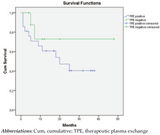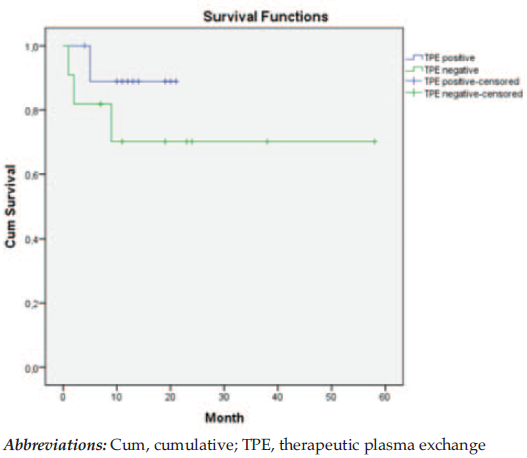 When we excluded the mild and moderate group of patients, there were 52 patients with severe (n = 21) and very severe (n = 31) disease. The 100-days OS rates were 87.1% (5/31 patients died) for patients who underwent TPE and 90.5% (2 of 21 patients died) for patients who did not. The 1-year OS rates were 69.6% (9/31 patients died) and 72.9% (5/21 patients died) for the TPE group and the non-TPE group, respectively (P = .15).