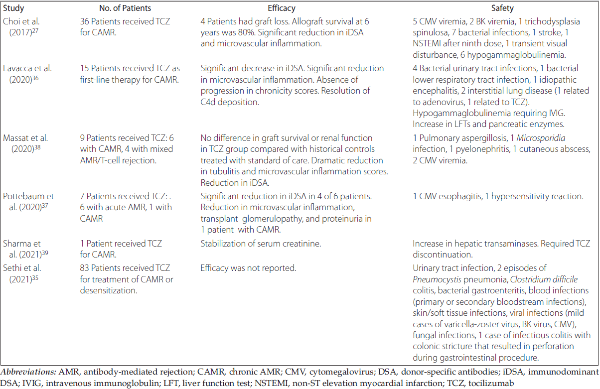 37. Pottebaum AA, Venkatachalam K, Liu C, et al. Efficacy and safety of tocilizumab in the treatment of acute active antibody-mediated rejection in kidney transplant recipients. Transplant Direct. 2020;6(4):e543. doi:10.1097/TXD.0000000000000988