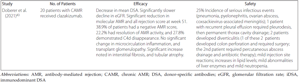 Lavacca and colleagues used tocilizumab as a first-line therapy for 15 patients with CAMR with severe transplant glomerulopathy and severe microvascular inflammation. Allograft loss was reported for a single patient, at 25.3 months after discontinuation of tocilizumab. There was a significant decrease in iDSA, along with a significant reduction in microvascular inflammation, and an absence of progression in chronicity scores or C4d deposition.36 Pottebaum and colleagues treated 7 patients with tocilizumab. Of these 7 patients, only 1 had CAMR, and this patient completed 6 months of tocilizumab therapy and demonstrated stable serum creatinine, marked reduction of iDSA, reduction of microvascular inflammation, and stabilization of transplant glomerulopathy and proteinuria.37 In the study by Sharma and colleagues, their patient with refractory CAMR (without DSA) was removed from tocilizumab therapy after the fifth dose due to rise in serum transaminases, but the creatinine returned to baseline and remained stable at 1 year follow-up.39
