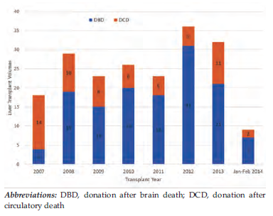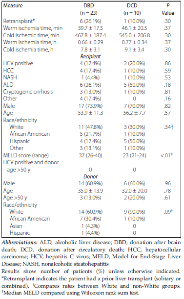 Results: Over the study period, 196 patients underwent liver transplant, with 33 (16.8%) undergoing simultaneous liver-kidney transplant. In this cohort, 23 and 10 patients, respectively, received grafts from donors after brain death versus circulatory death. Both groups were comparable with respect to age, sex, hepatitis C virus status, and presence of hepatocellular carcinoma. Median (range) Model for End-Stage Liver Disease score was higher in recipients of donation after brain death grafts (37 [26-40] vs 23 [21-24];